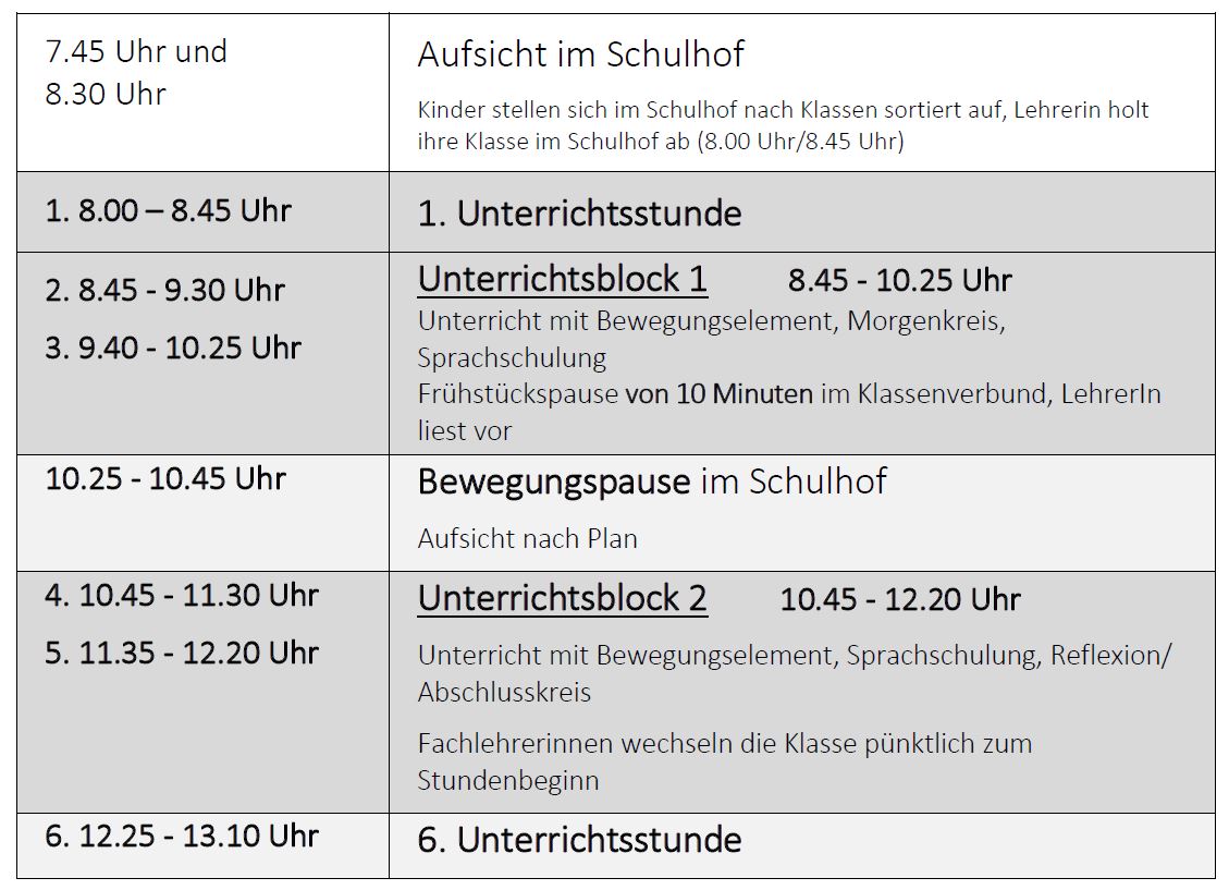 Die Unterrichtsstunden sind nur für die Fachlehrerstunden ausgewiesen. Ist ein Lehrer am Stück in einer Klasse, so kann er die Unterrichtsblöcke flexibel gestalten und die Pausen dem Lernrhythmus der Kinder anpassen.